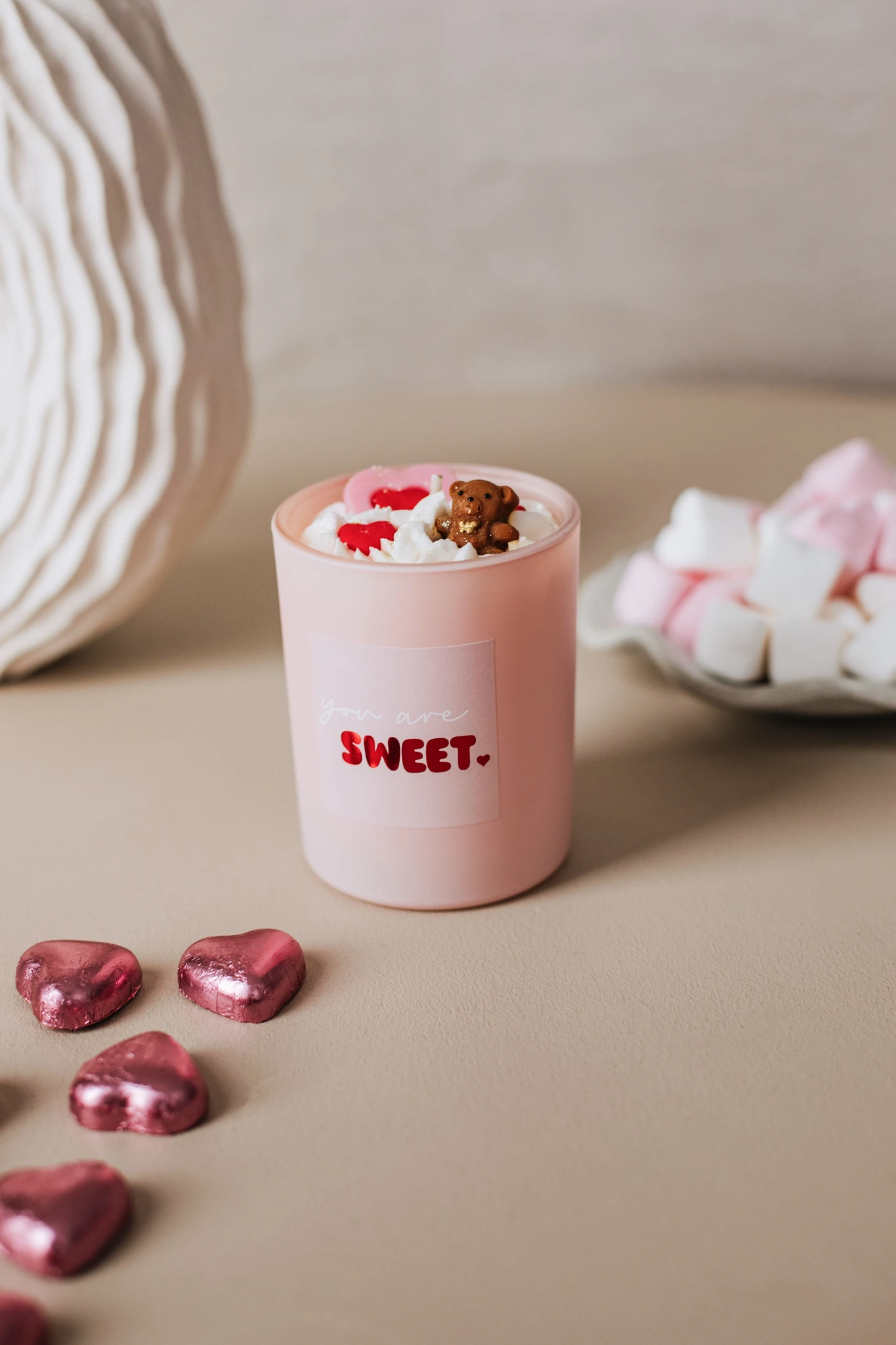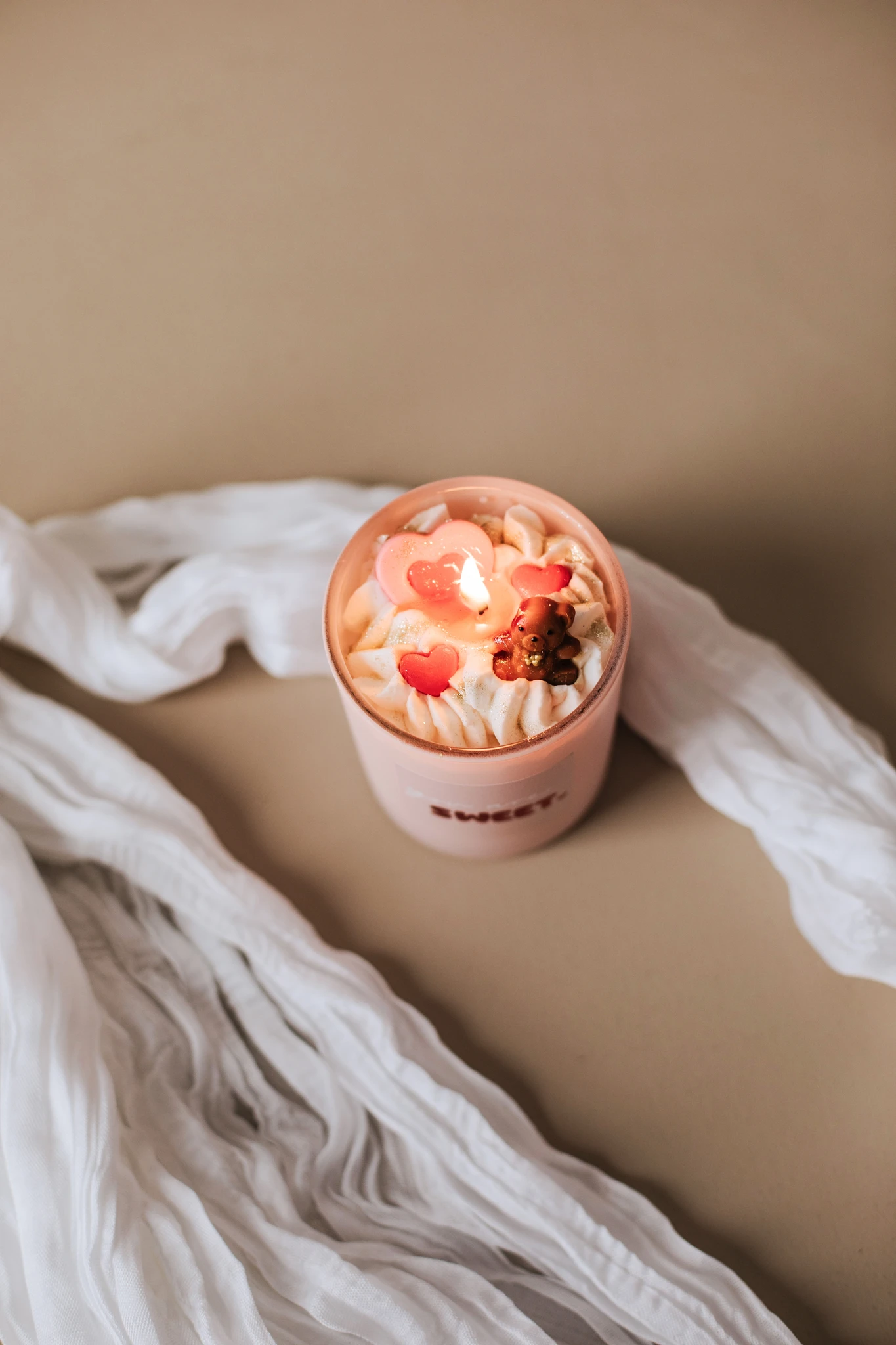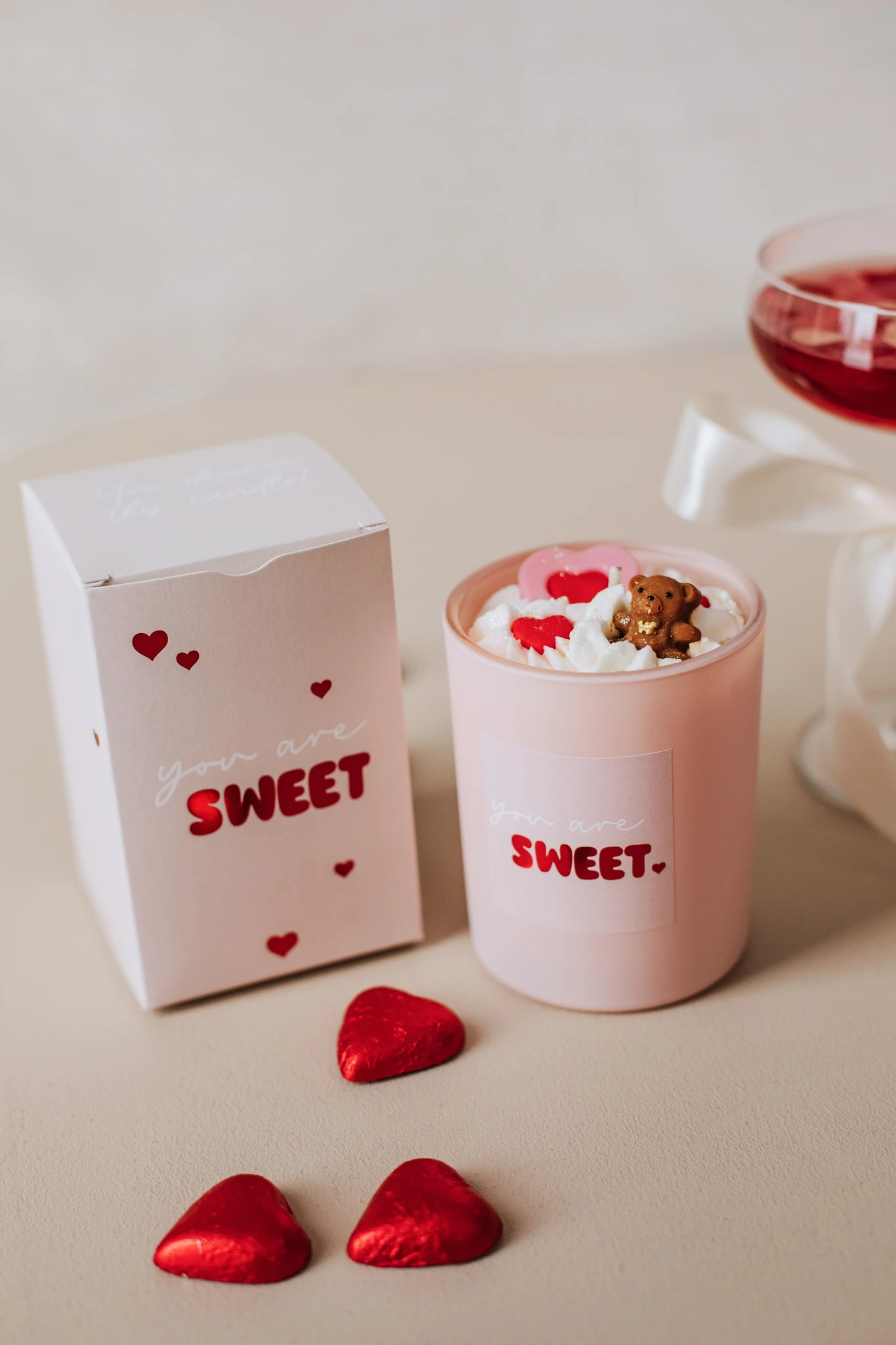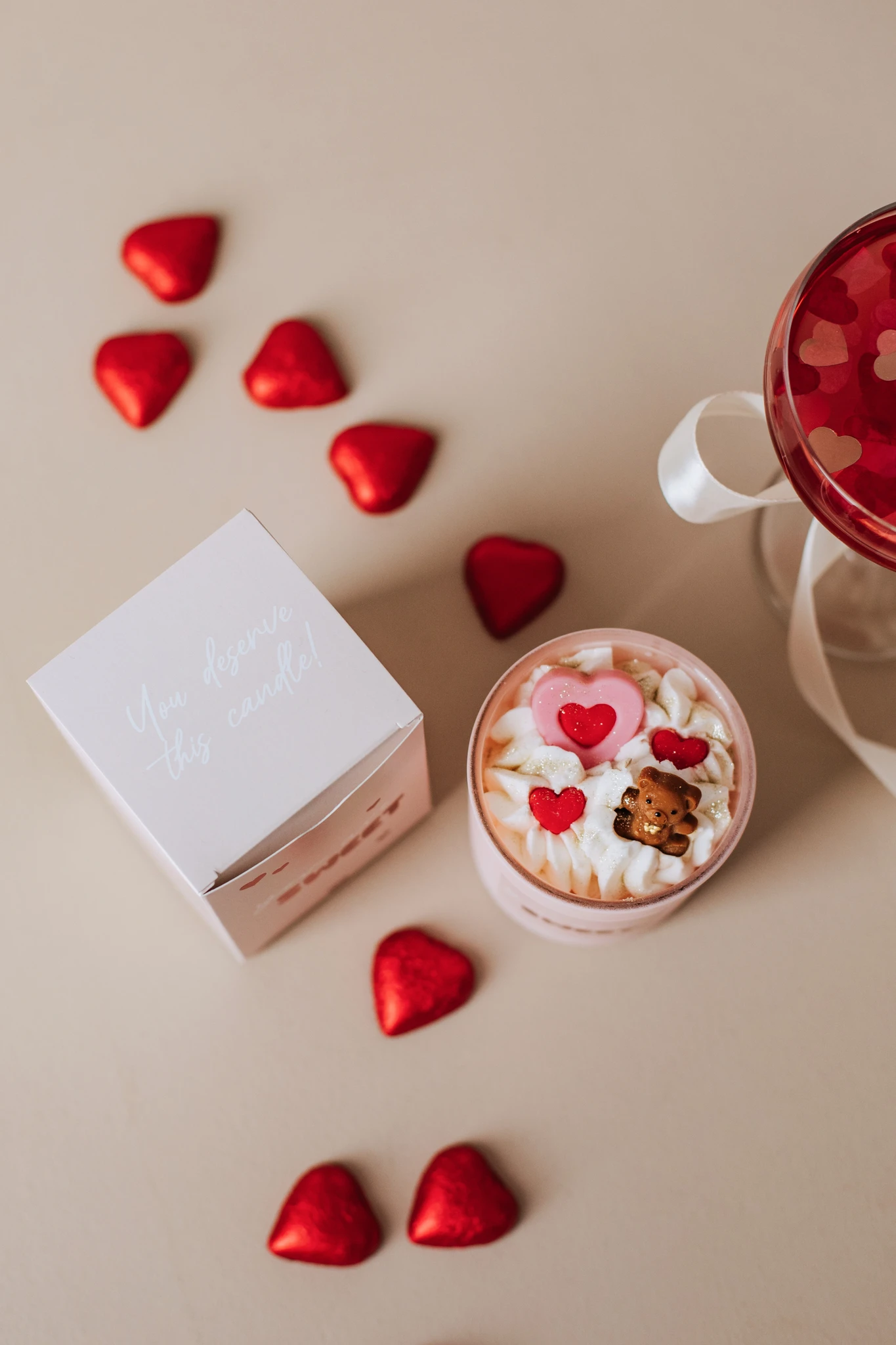Kõik küünlal olevad elemendid on valmistatud vahast ja on armastuse sümbolid. Punased ja roosad südamed ja pruun karu kuju. Ükski element ei ole mõeldud söömiseks! Hoida lastele kättesaamatus kohas!